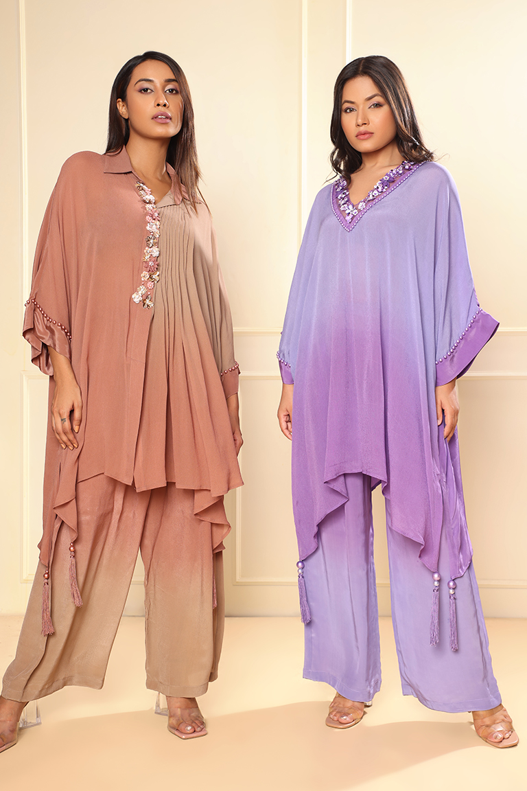 Shaded V-neck hand embroidered tunic with beaded cuffs and tassels on hem edges